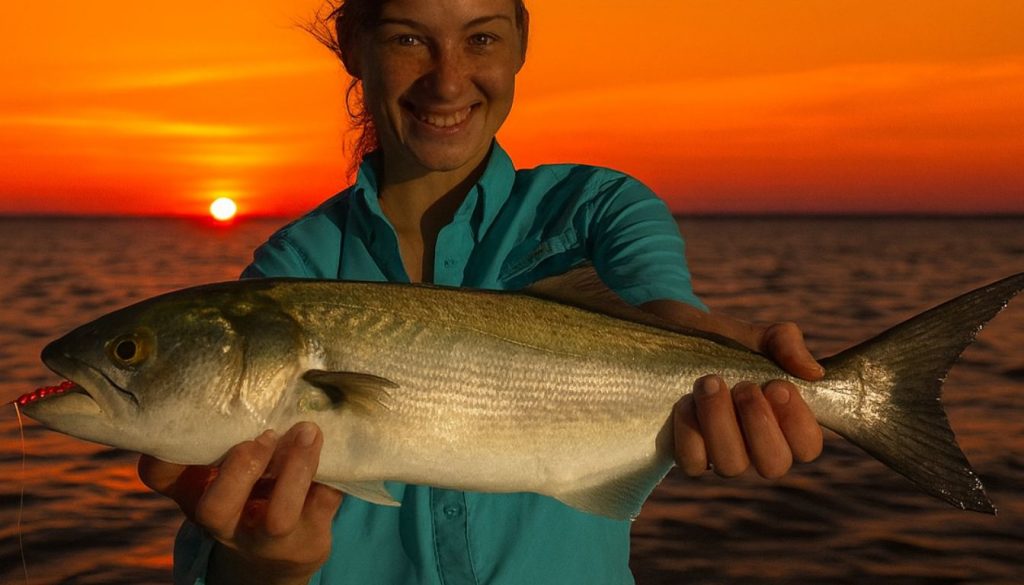 - Time of Day: Prime windows are usually early morning and late afternoon/dusk. In hot weather, midday fishing often slows as blues go deep. The “golden hour” before dark can trigger final blitzes. On cloudy or choppy days, however, blues may stay aggressive through midday. They have excellent vision and respond well to bright, erratic lures in low light.