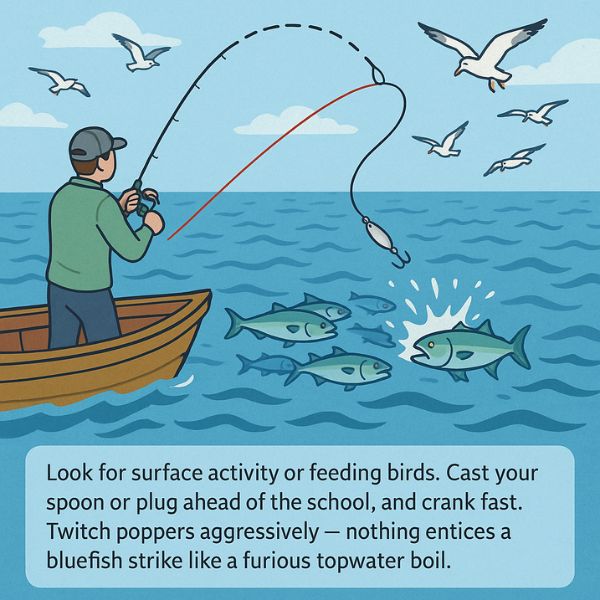 Casting and Retrieving: The bread-and-butter method. Look for surface activity or feeding birds, cast your spoon or plug ahead of the school, and crank fast. A sawtooth retrieve (burn, pause, jiggle, burn) often entices strikes. In general, fish your lure faster than you think: bluefish prefer a high-speed, erratic retrieve that mimics fleeing bait. Poppers should be twitched aggressively to splash and gouge water – nothing entices a bluefish strike like a furious topwater boil.