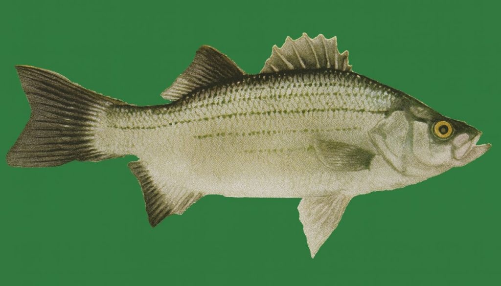 White bass (Morone chrysops) is a schooling freshwater temperate bass native to North America. They have a silvery-white body with 4–7 dark horizontal stripes (the top stripe typically extends unbroken) along each side.