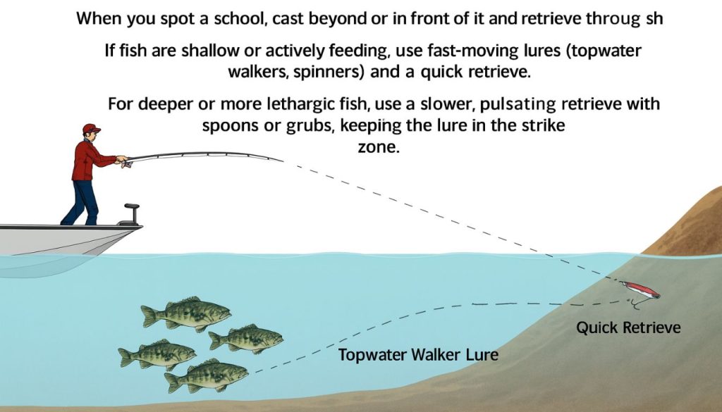 Main approach – Cast & Retrieve: When you spot a school, cast beyond or in front of it and retrieve through the school. If fish are shallow or actively feeding, use fast-moving lures (topwater walkers, spinners) and a quick retrieve. For deeper or more lethargic fish, use a slower, pulsating retrieve with spoons or grubs, keeping the lure in the strike zone. Vary your retrieve: a steady “crank” often works, but slight jerks or pauses can trigger reaction strikes.